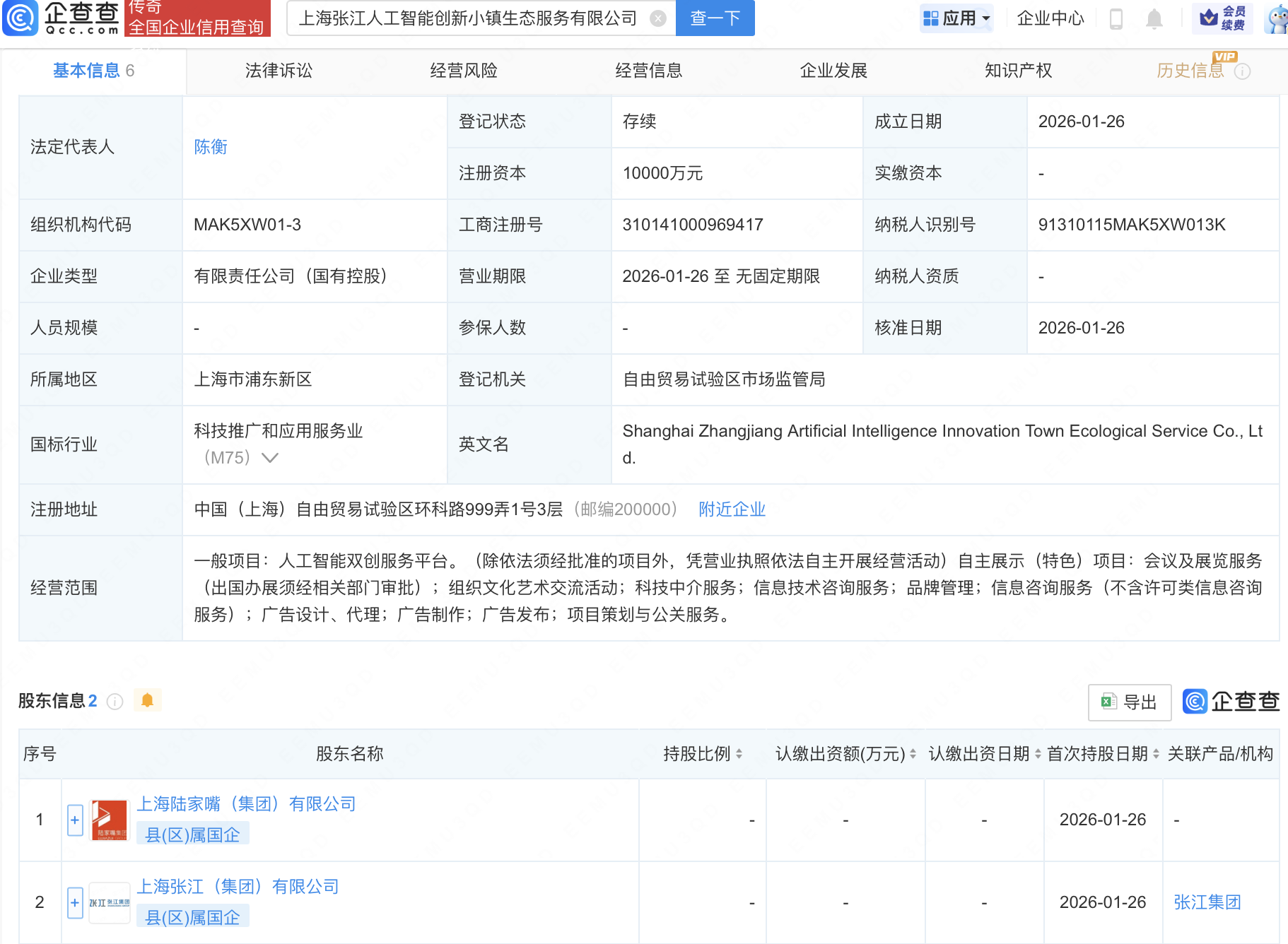 近日,上海张江人工智能创新小镇生态服务有限公司成立,注册资本1亿元,经营范围包含:人工智能双创服务平台;组织文化艺术交流活动;科技中介服务等。企查查股权穿透显示,该公司由上海陆家嘴(集团)有限公司、上海张江(集团)有限公司共同持股。
